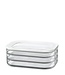 Vleeswarendoos Modula 550/3, voorzien van een doorzichtige deksel met witte ring. De rechthoekige Modula vleeswarendoos met afgeronde hoeken heeft een inhoud van 1650 ml en geeft direct zicht op inhoud, ook in de koelkast!